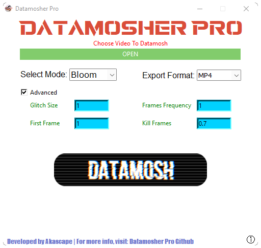 The effects are inspired from ItsKaspar's tomato.py and Joe Friedl's pymosh which can only handle .avi file structures, but in Datamosher Pro you can use any video file type including mp4, avi, gif, mov, mkv +more. The files are first converted to avi file using Imageio-ffmpeg without losing much quality and then the effect is applied and then again the corrupted file is converted to stable version using the same process so that the output video can be directly used in other softwares for editing without any error. A raw file option is also available if needed. You will not find this type of GUI program anywhere with so many free effects, I hope there is no error in the program but if you find any bug then raise an issue. You can also help to make new datamosh effects. All the logo and designs are created by me.