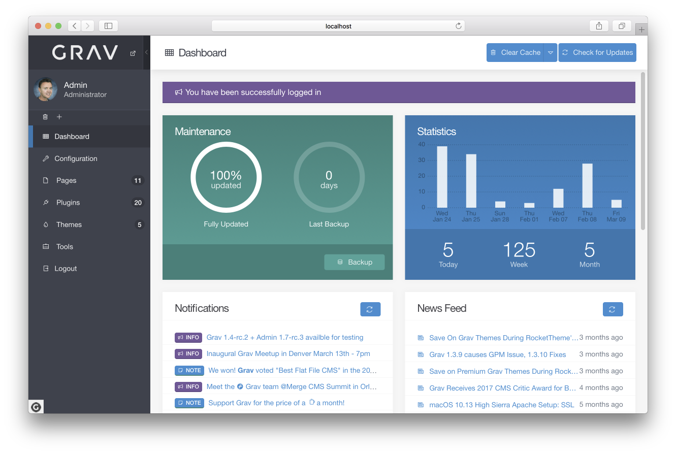 This admin plugin for Grav is an HTML user interface that provides a convenient way to configure Grav and easily create and modify pages. This will remain a totally optional plugin, and is not in any way required or needed to use Grav effectively. In fact, the admin provides an intentionally limited view to ensure it remains easy to use and not overwhelming. I'm sure power users will still prefer to work with the configuration files directly.