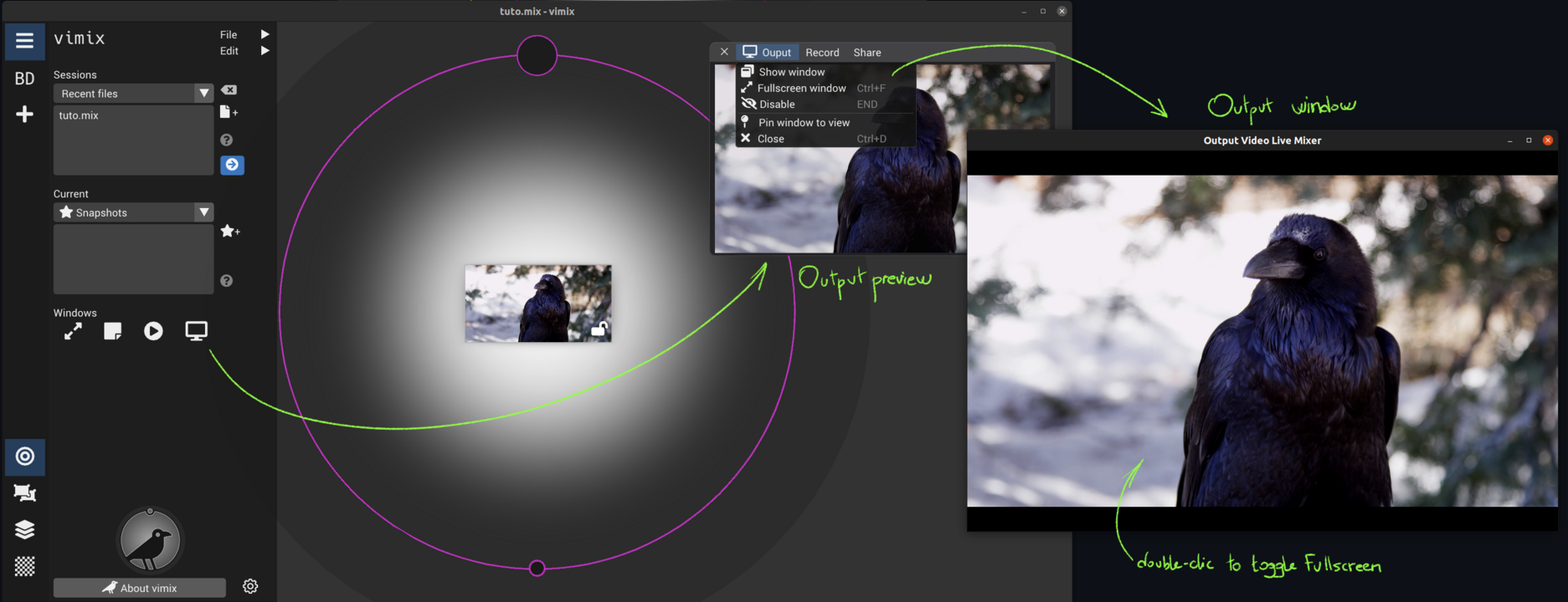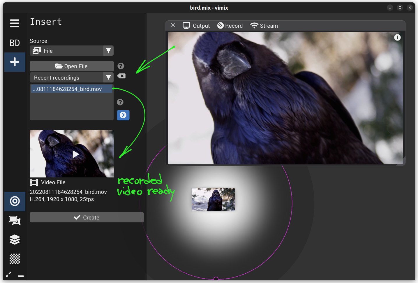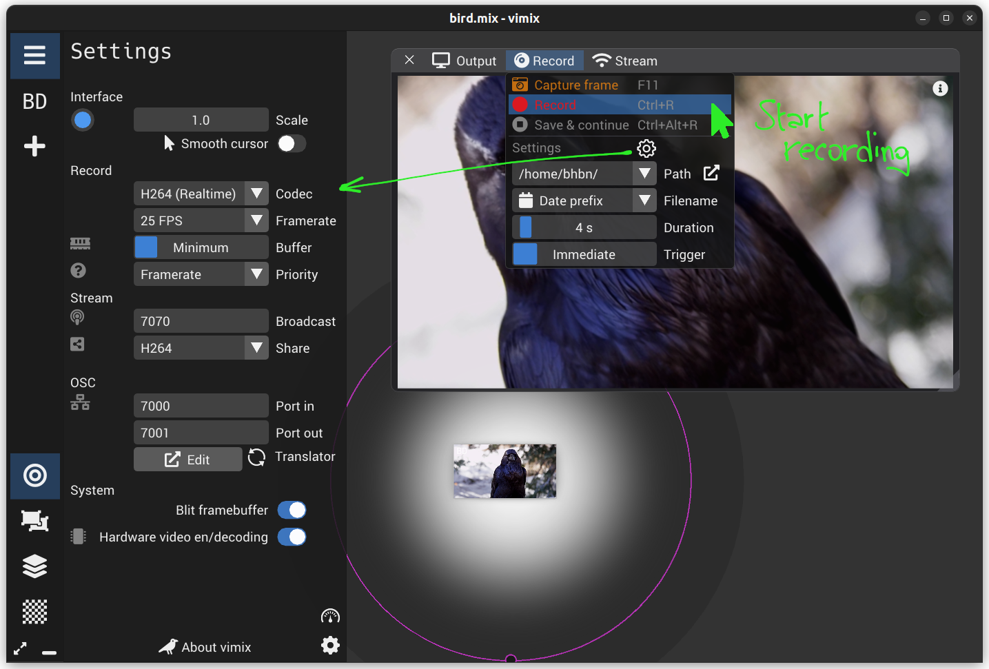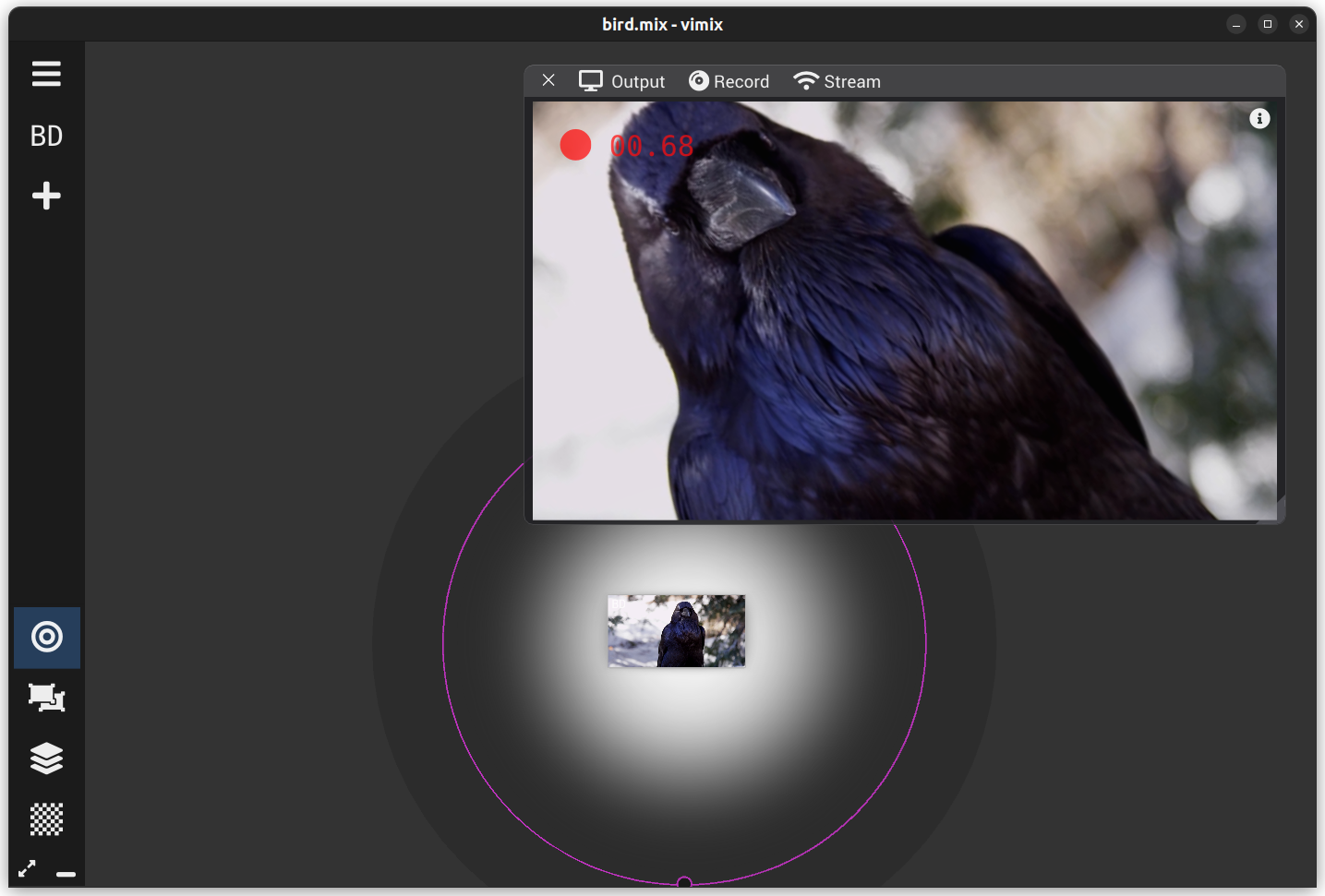 During recording, all normal operations in vimix are possible. The output window shows the indication of recording duration.