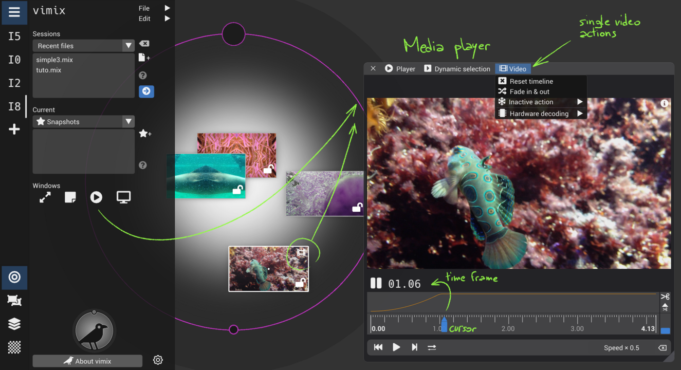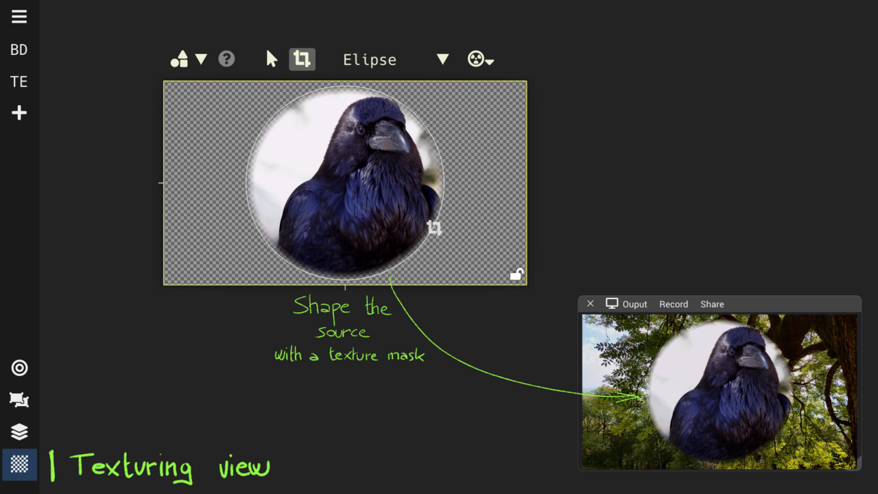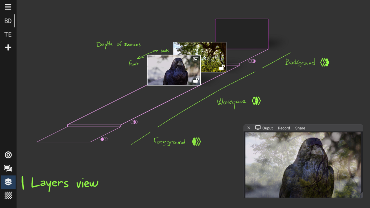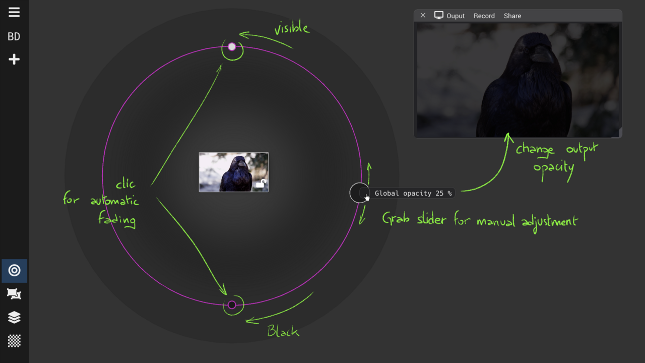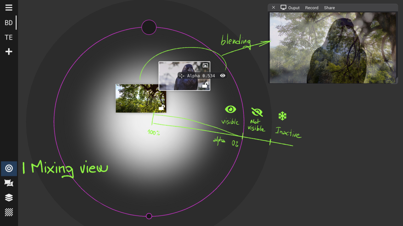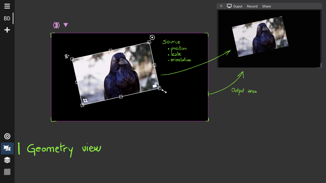 During recording, all normal operations in vimix are possible. The output window shows the indication of recording duration.