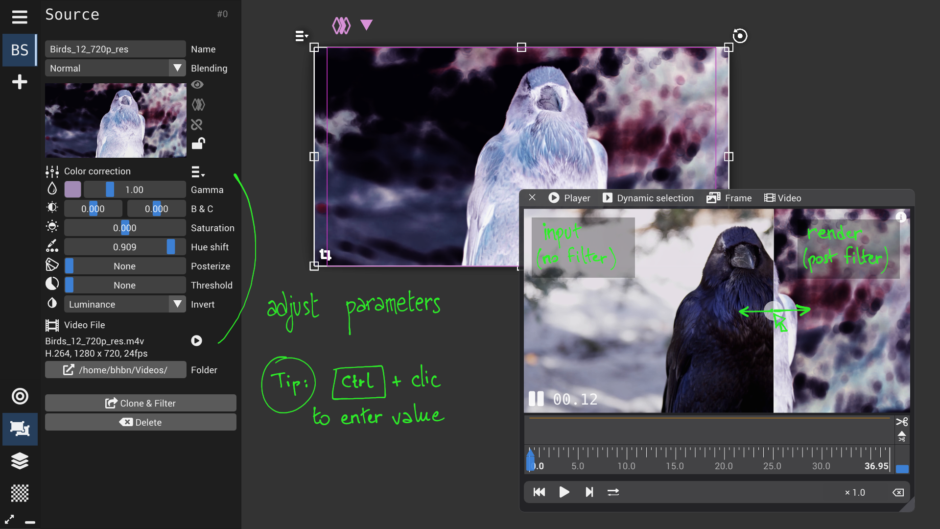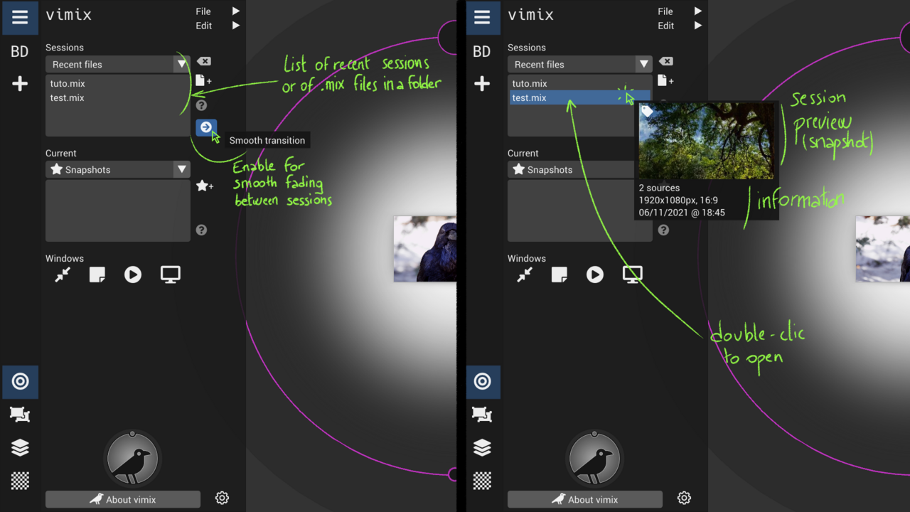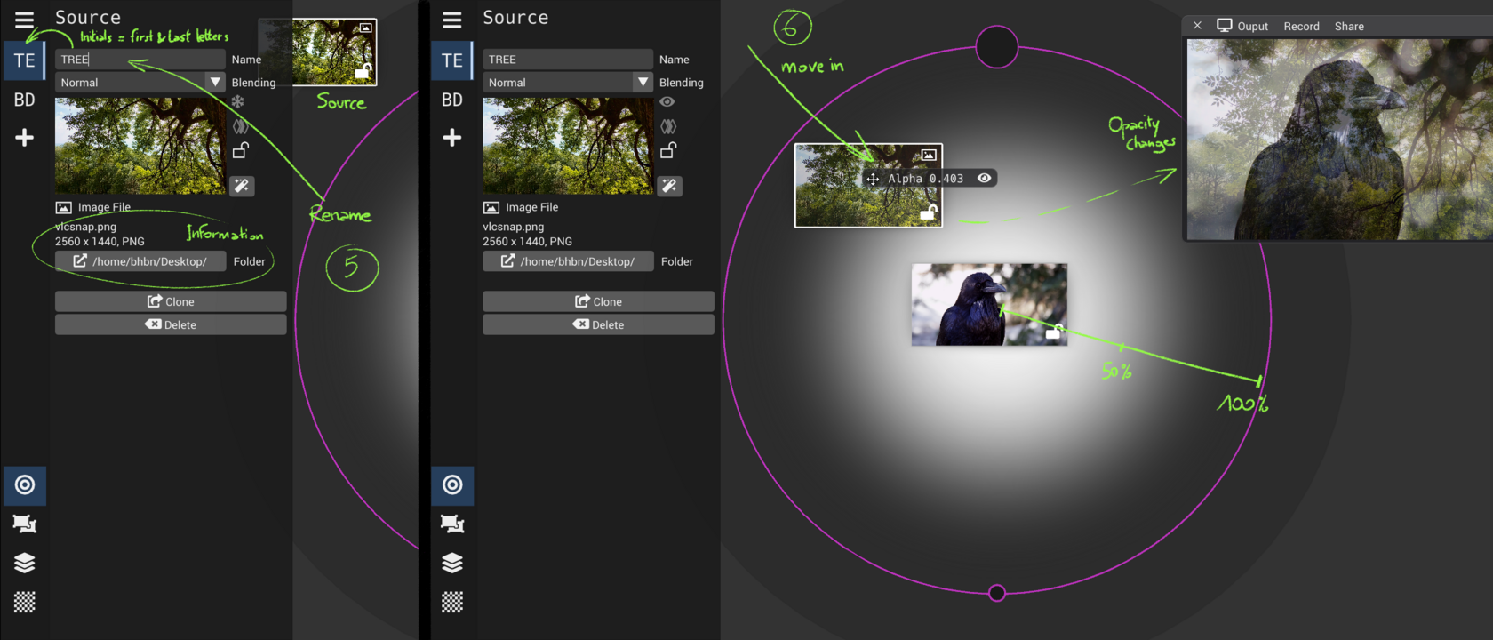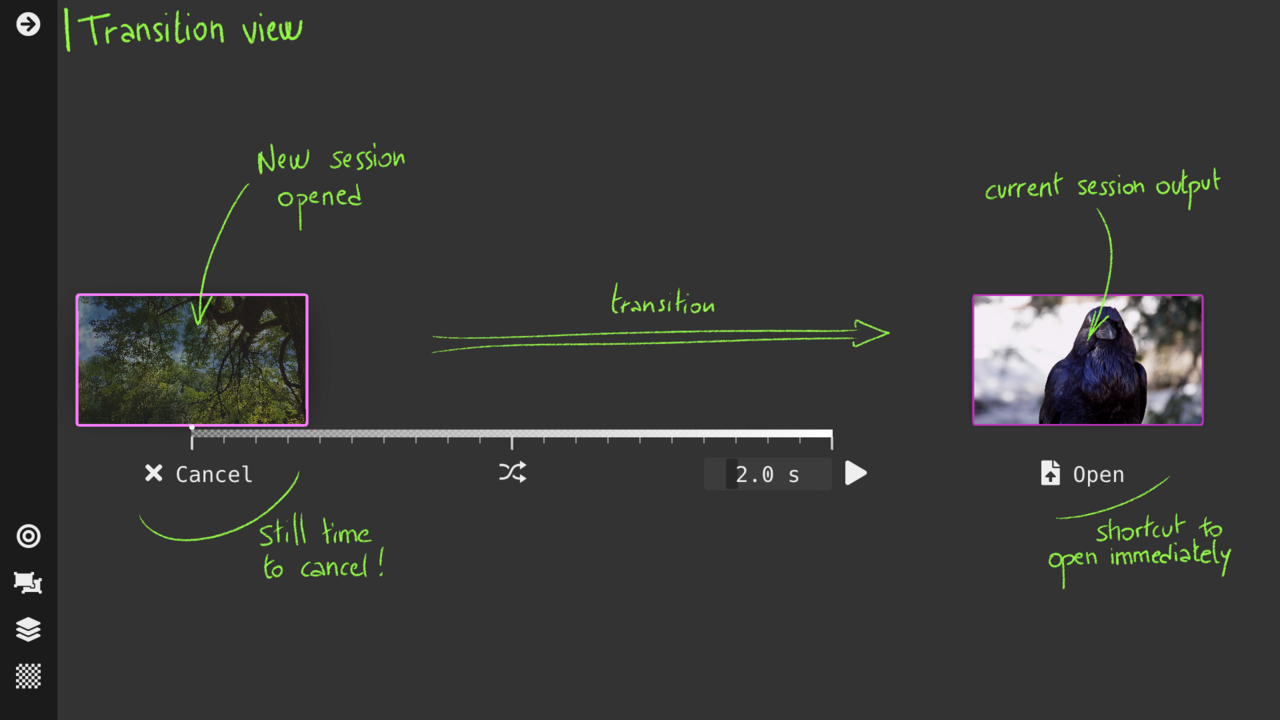 During recording, all normal operations in vimix are possible. The output window shows the indication of recording duration.