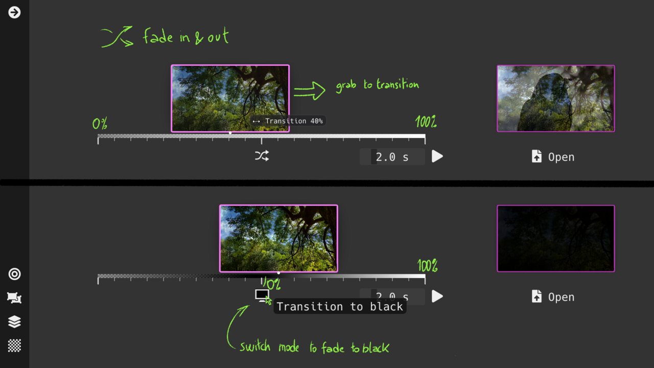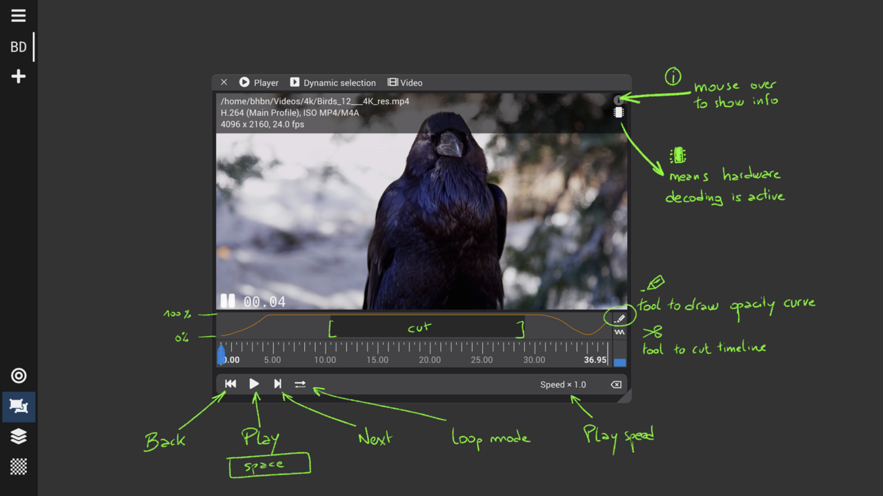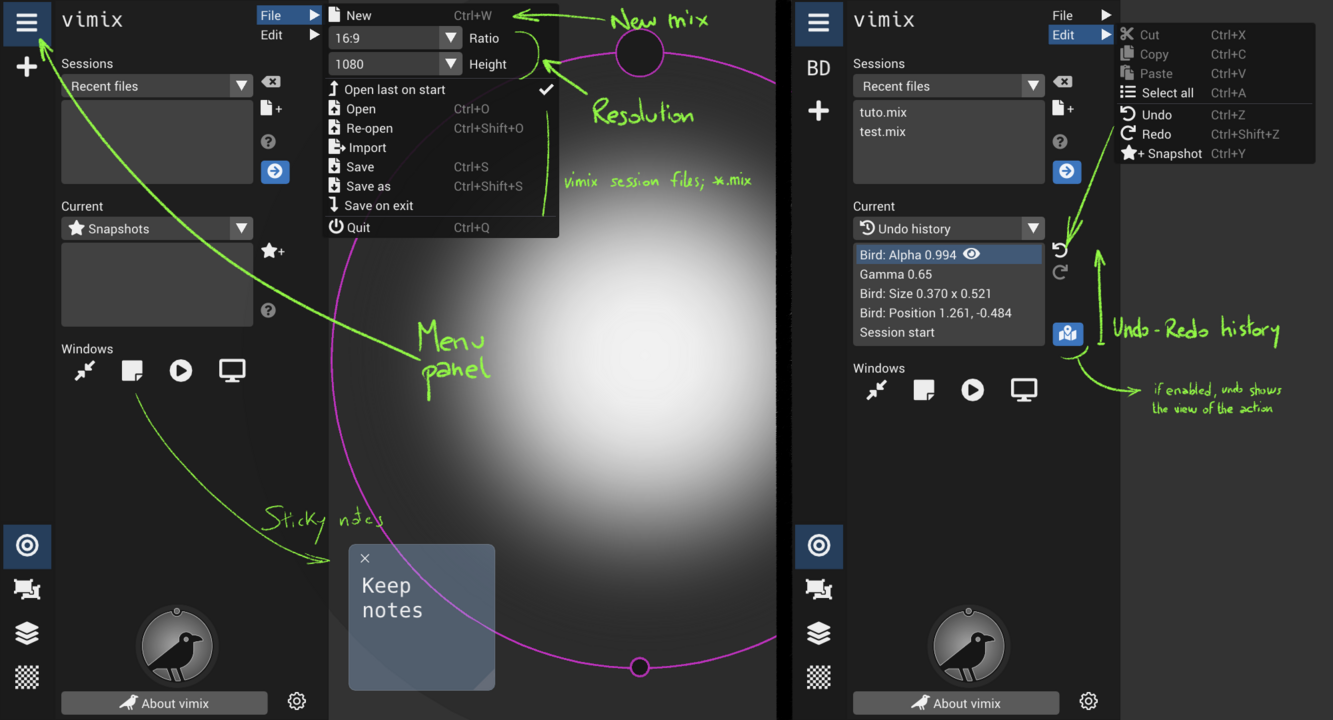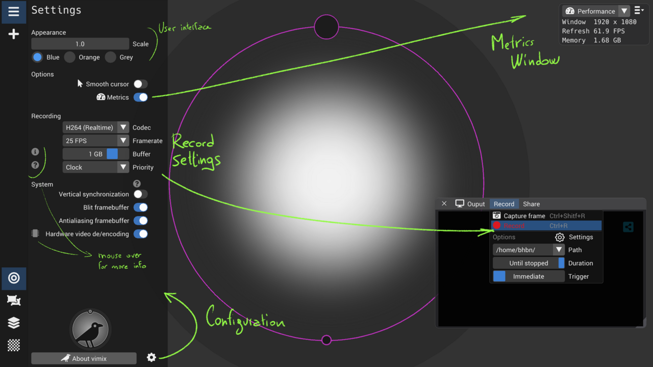 Codec: Video file internal format; this affects quality and recording speed. H264 are the fastest (and GPU accelerated). Others offer a better image quality preservation but are slower.Framerate: Frame rate of the video; 15, 25 or 30 FPS (the higher, the more to encode).Buffer: How much RAM you wish to allocate for the recording buffer: large buffer allows storing in RAM some seconds of rendering to give time for the computer to encode the video in the background (after recording stopped).Priority: If the buffer gets full, it can happen that the recording gets delayed from the real time; vimix can either give priority to maintain a constant framerate in the produced video (the duration is altered), or to ensure frame timestamps and duration are correct (the framerate is altered).