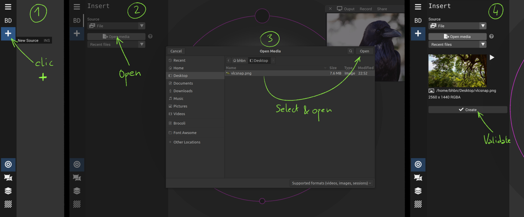 Insert a source with +; the source type File with the list of Recent recordings appears by default after a new recording (i.e. the auto-preload option is enabled)
